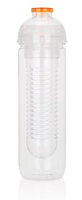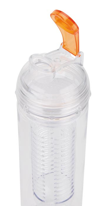 Butelka wykonana jest z solidnego przezroczystego tritanu oraz tworzywa sztucznego w kolorze pomarańczowym.