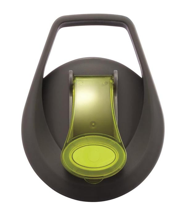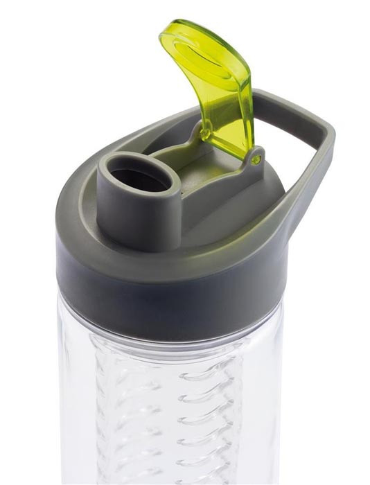 Butelka wykonana jest z solidnego przezroczystego tritanu oraz tworzywa sztucznego w kolorach grafitowym i zielonym.