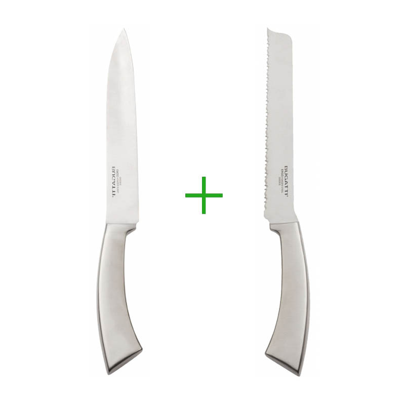 Posiada przegródki, w których mieszczą się dwa noże Ergo wykonane ze stali nierdzewnej: do chleba oraz do mięsa.