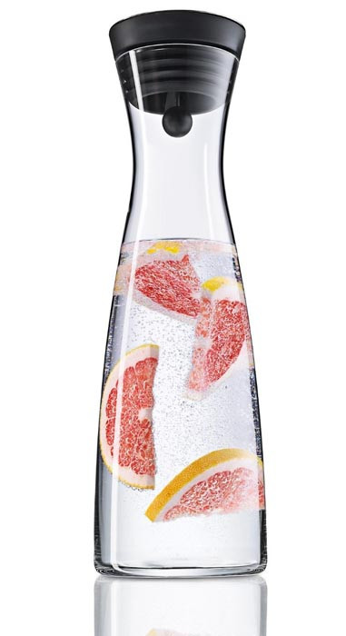 W karafce z kolekcji Basic WMF pięknie prezentuje się woda niegazowana lub smakowa z kawałkami owoców i listkami mięty. Karafka o pojemności 1,5 l wykonana jest ze szkła i ma zakrętkę z tworzywa sztucznego oraz czarnego silikonu.