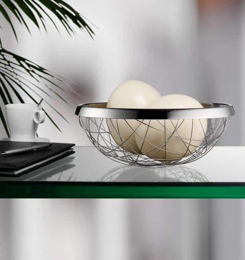 Ma on ażurową formę, którą tworzy ręcznie formowany wzór z polerowanego, stalowego drutu. Całość spina obręcz z matowej stali nierdzewnej Cromargan®.