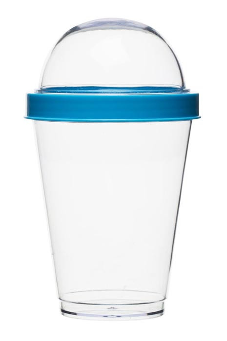 Kubek wykonany jest z tworzywa sztucznego bezpiecznego dla żywności i ma niebieską pokrywkę. Łatwy do mycia i polecany dbającym o linię.