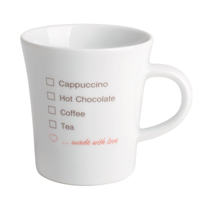 Kubek Love na ściance ma listę napojów, które można wybrać stawiając krzyżyk w danym okienku. W zależności od tego czy nalane zostało cappuccino, gorąca czekolada, kawa lub herbata można oznaczyć właściwy napój.