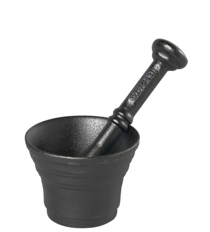 Moździerz w zestawie z tłuczkiem, obie rzeczy wykonane z wysokiej klasy żeliwa. Doskonale nadaje się do ucierania przypraw/ziół lub przygotowywania marynat do nacierania mięsa i ryb.