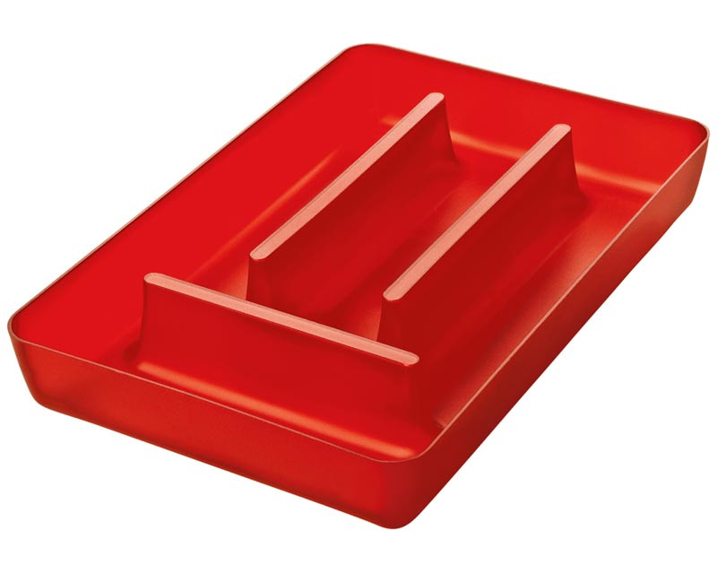 Zmieszczą się w nim też długie noże np. do chleba. Wykonany jest z mocnego, czerwonego tworzywa sztucznego.