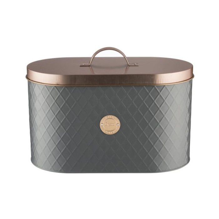 Jednym z elementów kolekcji jest duży pojemnik, który można zawiesić na ścianie (zestaw montażowy w komplecie). Wykonany został z ceramiki i umieszczony w stelażu z malowanego na miedziany kolor metalu.