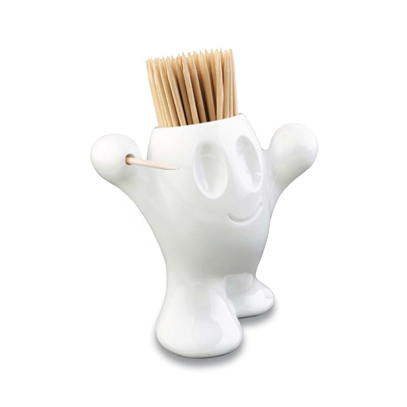 Zabawny pojemnik na wykałaczki z białego tworzywa sztucznego ma formę ludzika z bujną fryzurką, który rzuca oszczepem. Projekt jest tak przemyślany, że doskonale współgra z wykałaczkami, które tworzą włosy i oszczep.