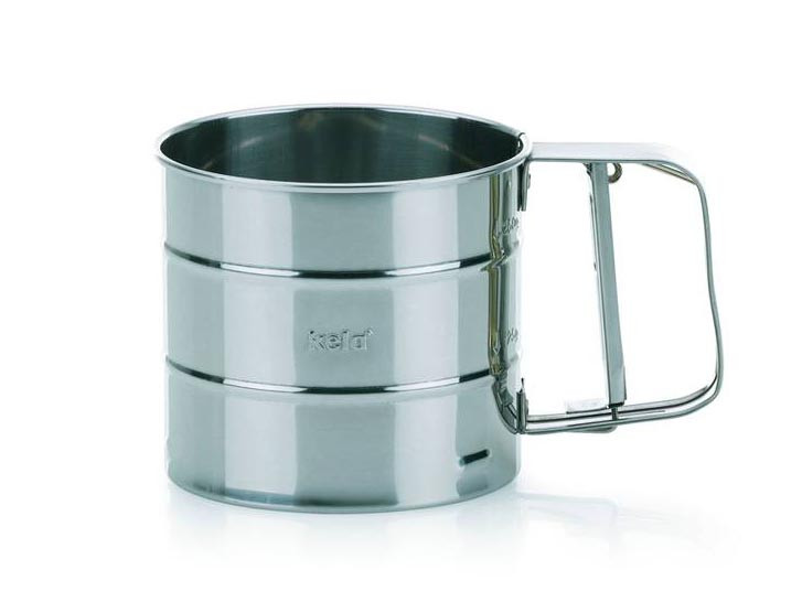 Przesiewak wykonany jest ze stali nierdzewnej i posiada system połączony z dźwignią w uchwycie, dzięki któremu jedną ręką można przesiać potrzebny składnik.