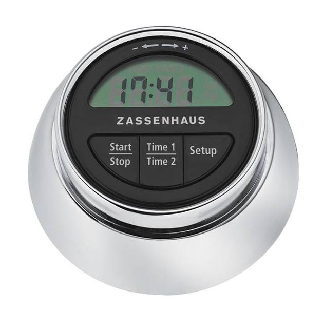 Timer cyfrowy Speed Zassenhaus swoją formą nawiązuje do stylu retro. Wykonany jest z chromowanego metalu i wyposażony w magnes na spodniej stronie.