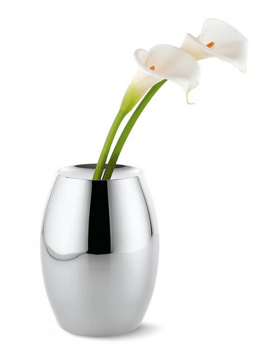 Ma kulisty kształt i wykonany jest z polerowanej stali nierdzewnej. W lustrzanej powierzchni pięknie odbijają się kwiaty, zwiększając dekoracyjność wazonu.
