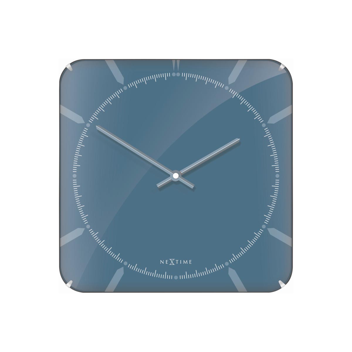 Zegar wykonany jest ze szkła i nie ma oznaczeń godzin – czas pokazują proste wskazówki.