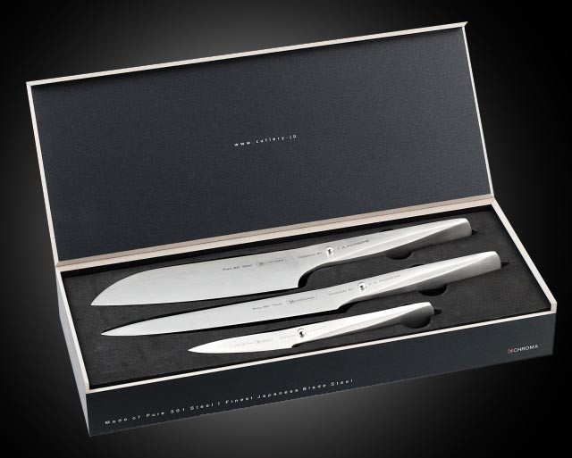 Zestaw trzech noży Type 301 CHROMA. Komplet składa się z noża santoku, noża do plastrowania oraz z krótkiego obieraka (7,7 cm) i jest zapakowany w eleganckie, drewniane pudełeczko. Jest także doskonałym pomysłem na prezent.